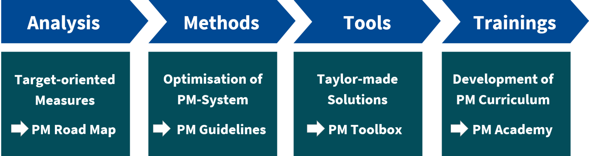 Following a comprehensive analysis of existing methods, processes, tools and structures, we will jointly develop your project management roadmap with result-oriented optimisation measures and a tangible implementation plan.
